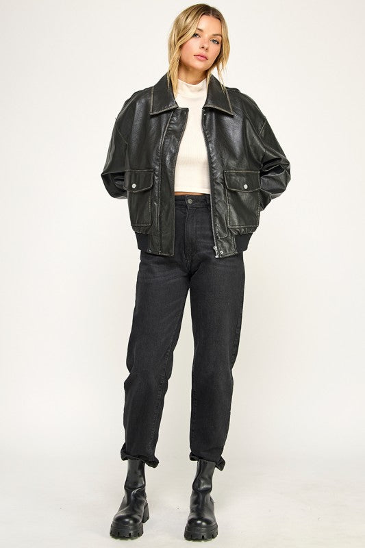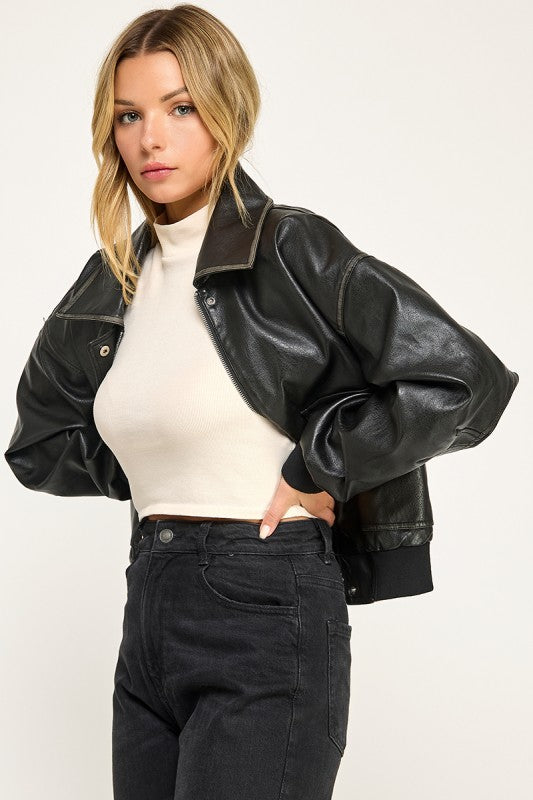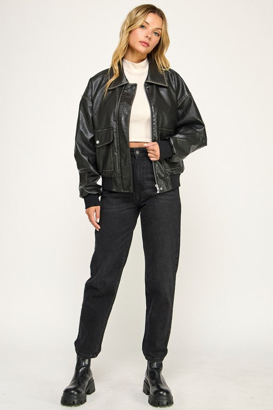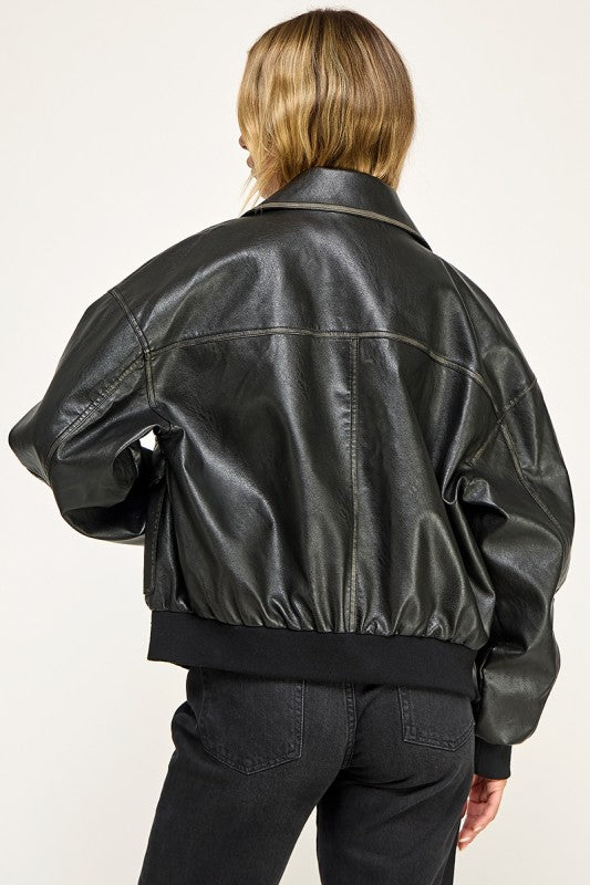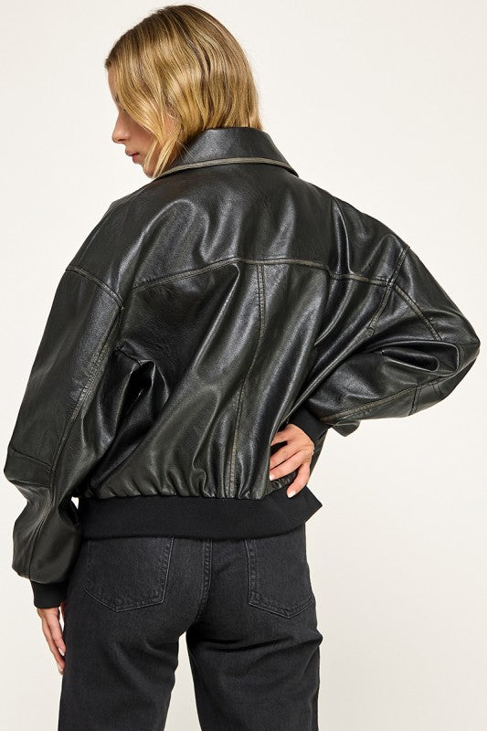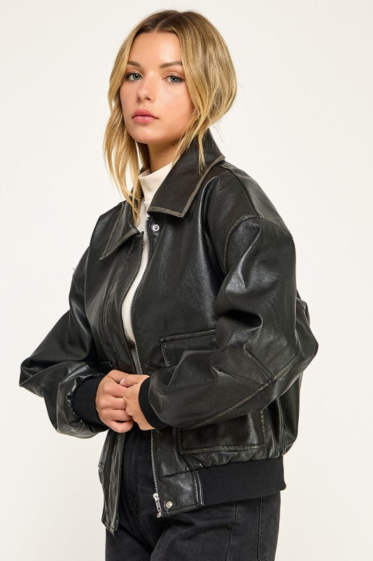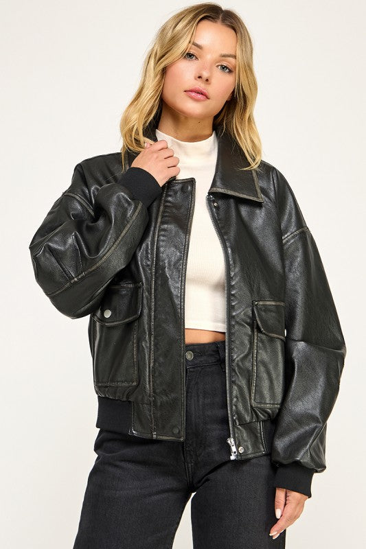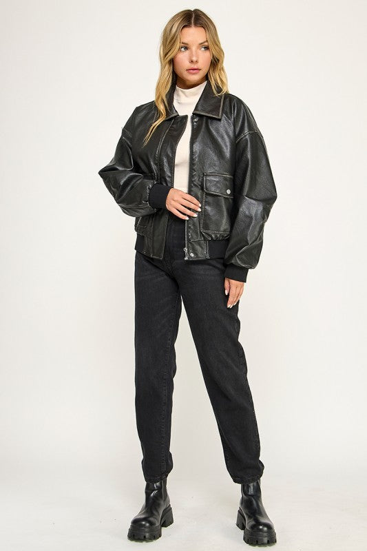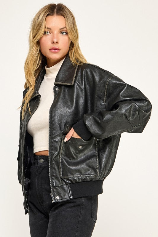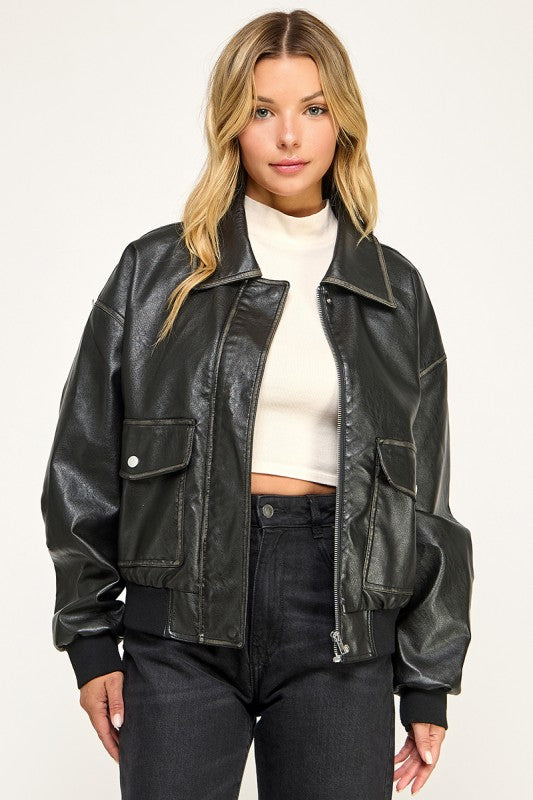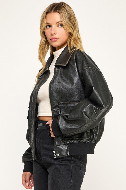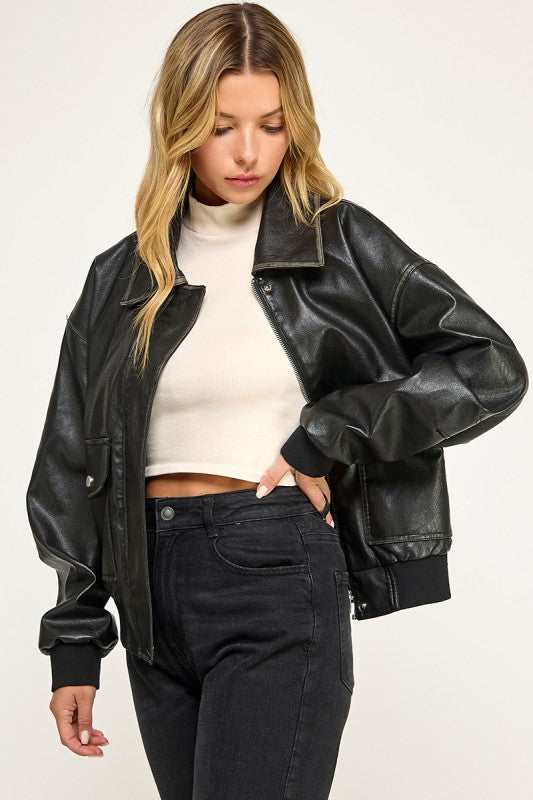 This edgy bomber jacket brings a bold statement to any outfit with its silhouette and sleek faux leather finish. Featuring a zip-up front, flap and welt pockets, and ribbed knit trim at the cuffs and hem for a structured, comfortable fit. The wide collar adds a touch of attitude while keeping things timeless. A must-have layer for cool weather and effortless street style.